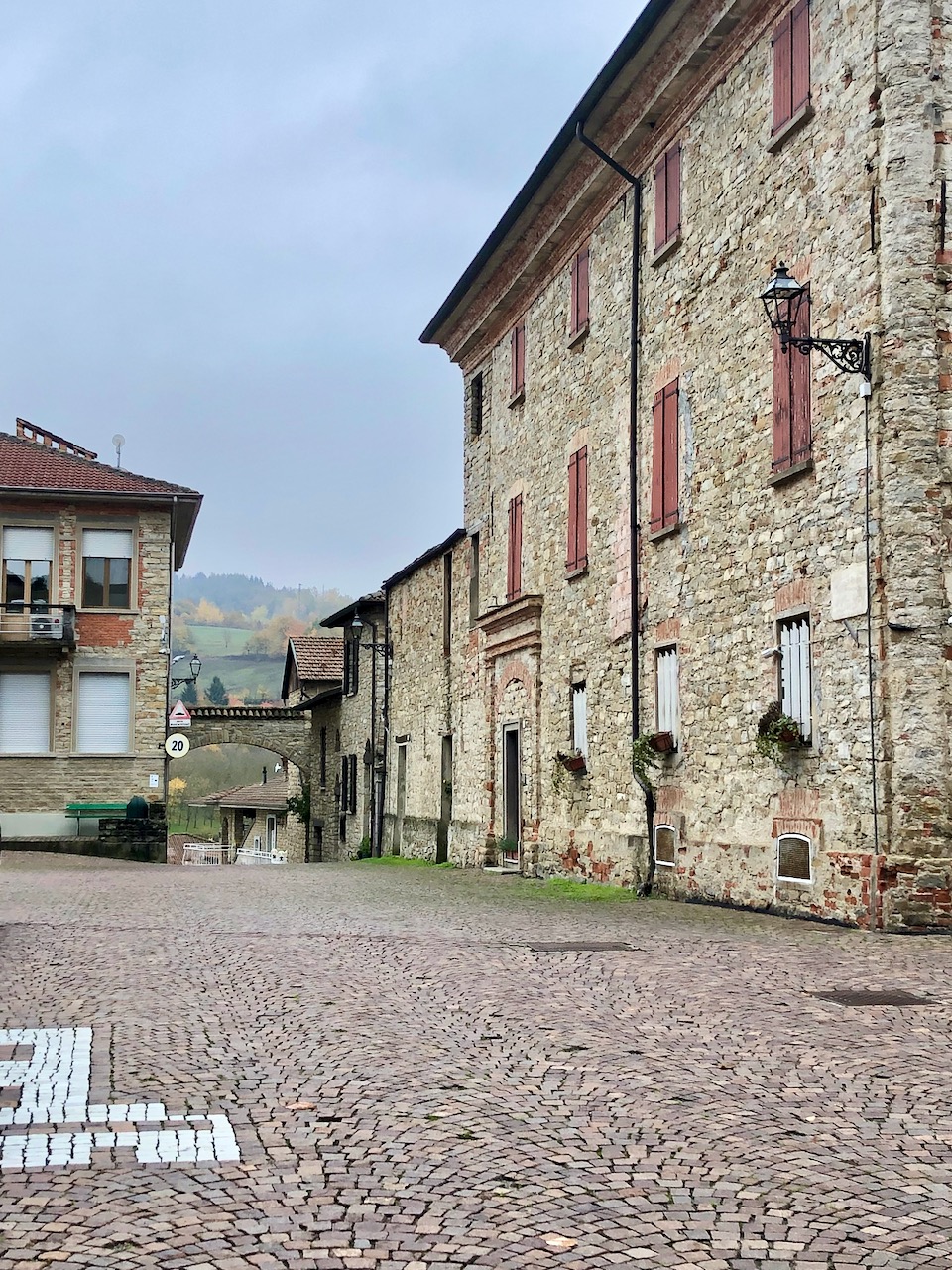 Village center in Perletto, Alta Langa, where the buildings are made of stone from the Bormida River below.