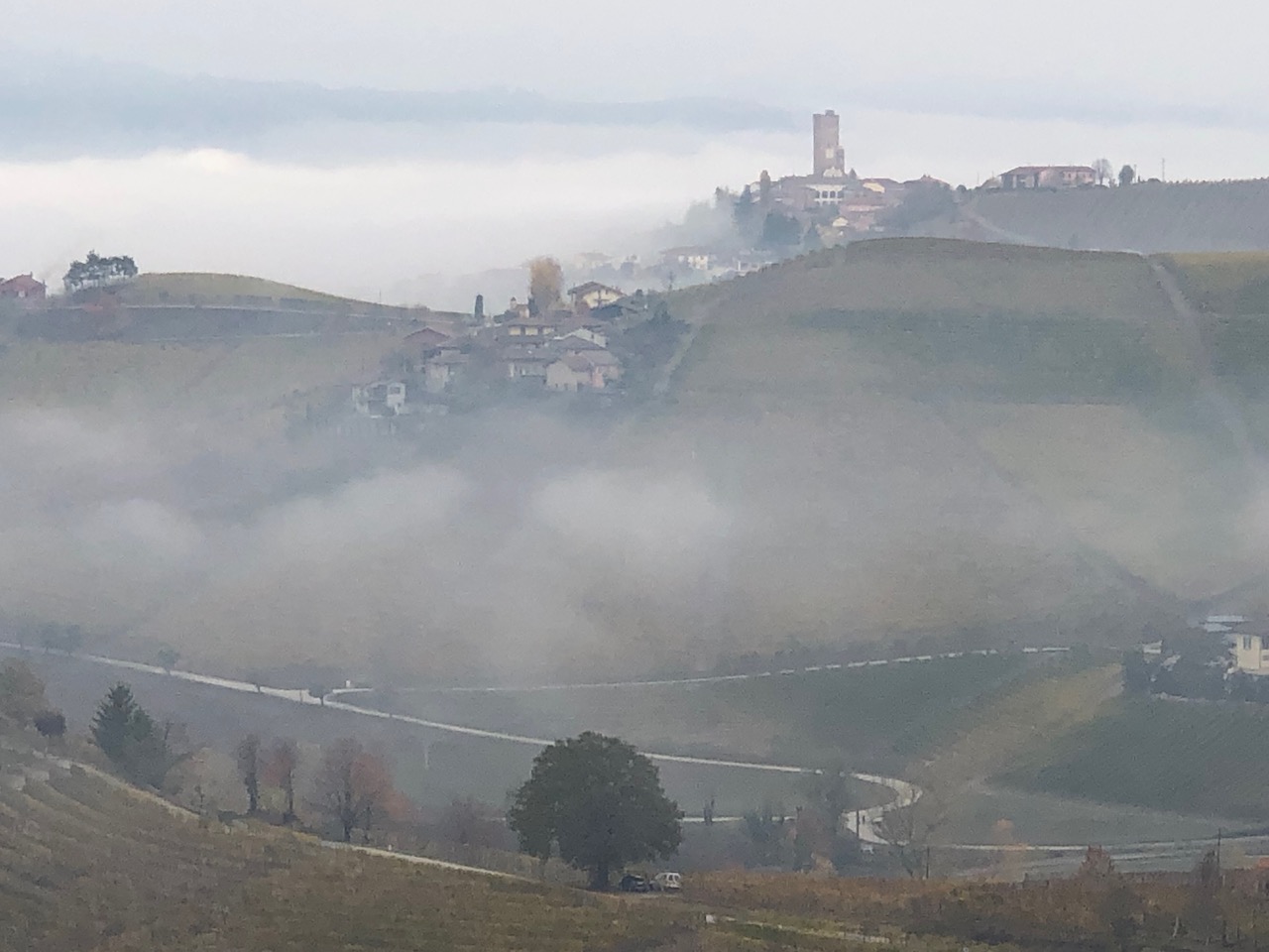 Asili and Barbaresco tower as seen from below Cascina delle Rose above the Rio Sordo valley on a foggy November day.